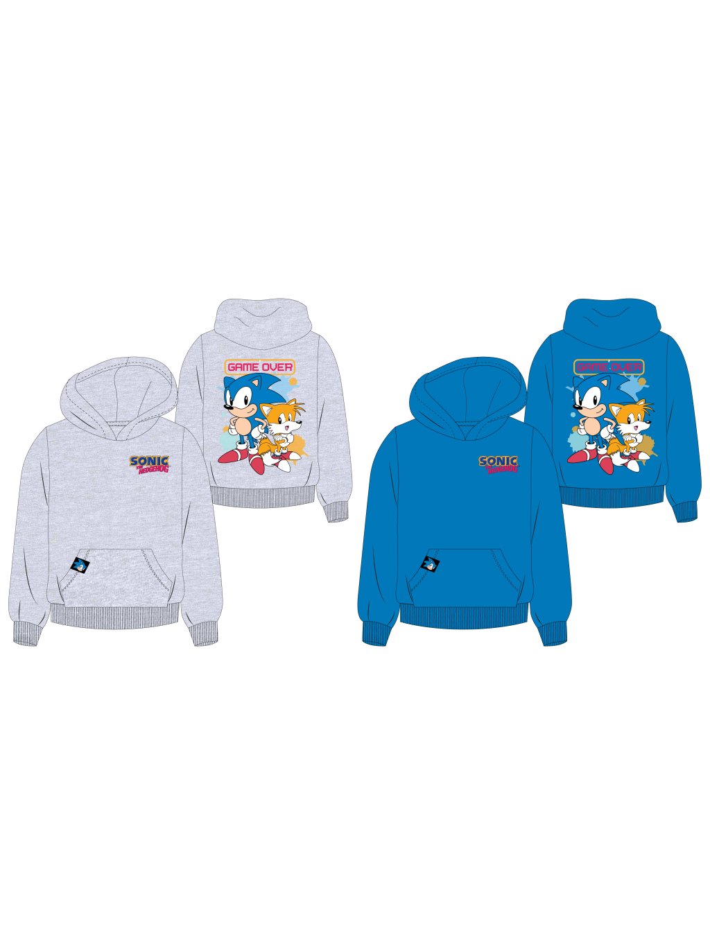 Chłopięca bluza z kapturem, długim rękawem i kapturem, futerkiem w środku, kieszenią typu „kangur”, rękawy i talia wykończone warkoczem, napis z przodu i nadruk Sonic the Hedgehog z tyłu.