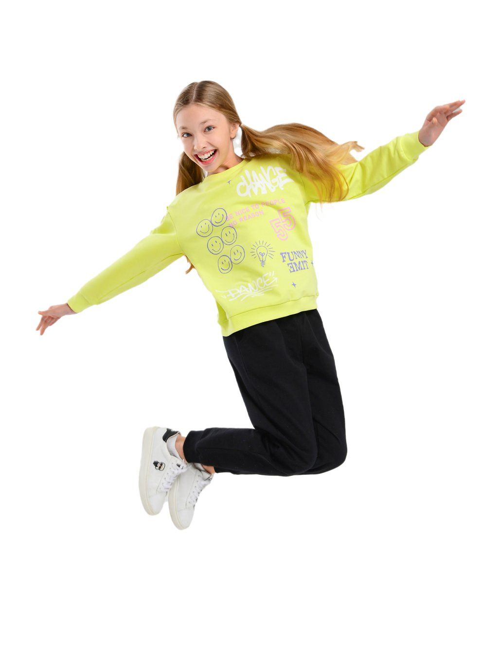 Dziewczęca bluza do tańca z kolekcji Comics. Kolor: żółty. Rękawy i dół wykończone gumką. Wysoka jakość wykonania. Materiał: nieczesana dzianina dresowa Footer 250-260 g.