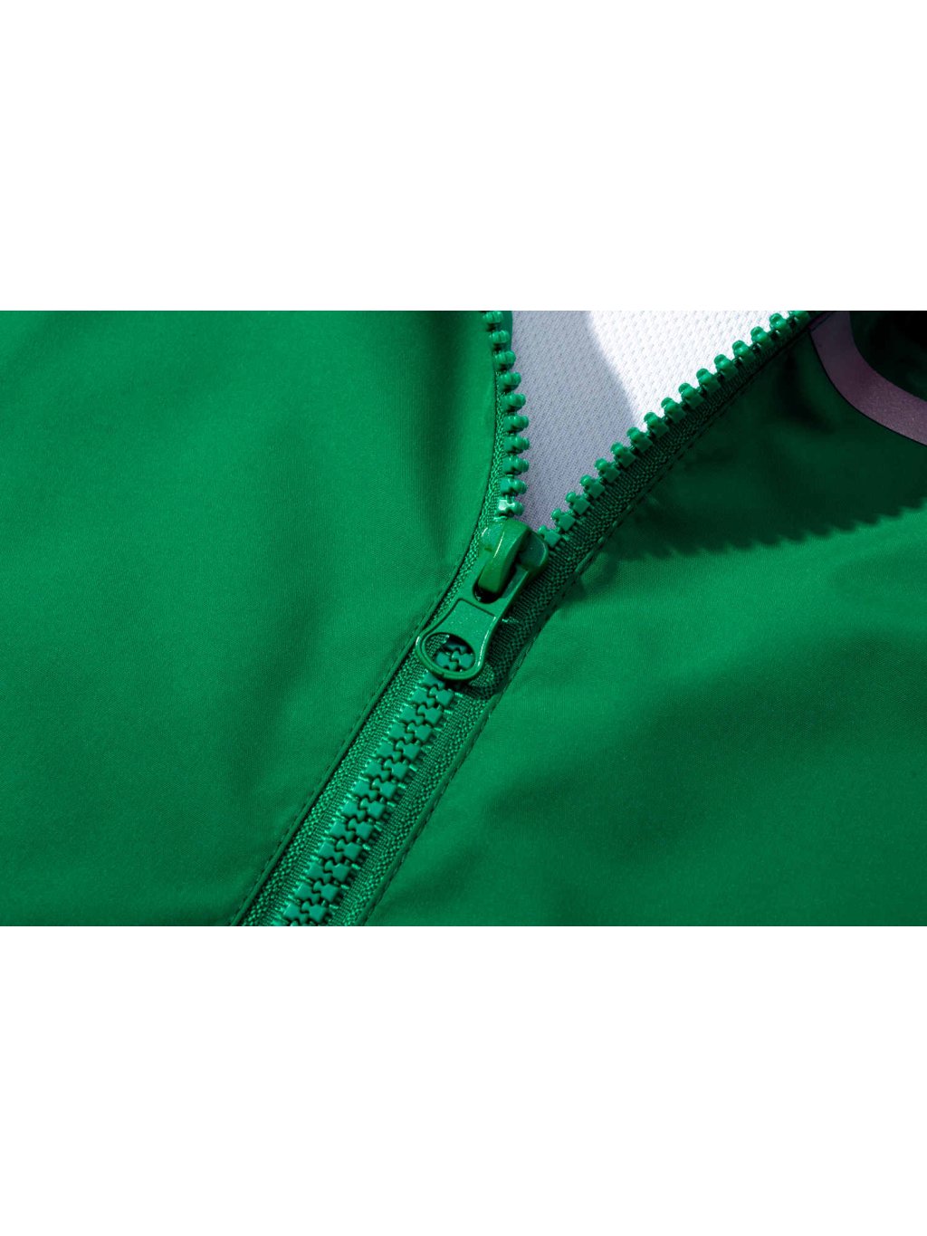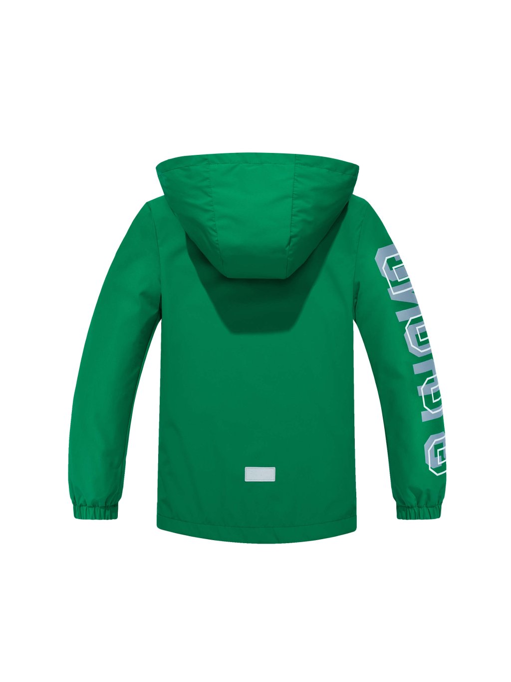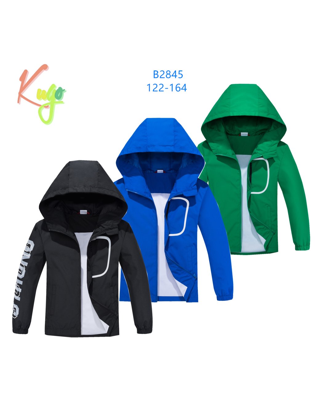 Kurtka chłopięca wiosenno-jesienna z kapturem, podszewką perforowaną (z dziurami) bez polaru, wodoodporna, wiatroszczelna, zapinana na zamek pod szyją, dwie kieszenie, jedna kieszeń na piersi zapinana, elementy sygnalizacyjne, napis na rękawie