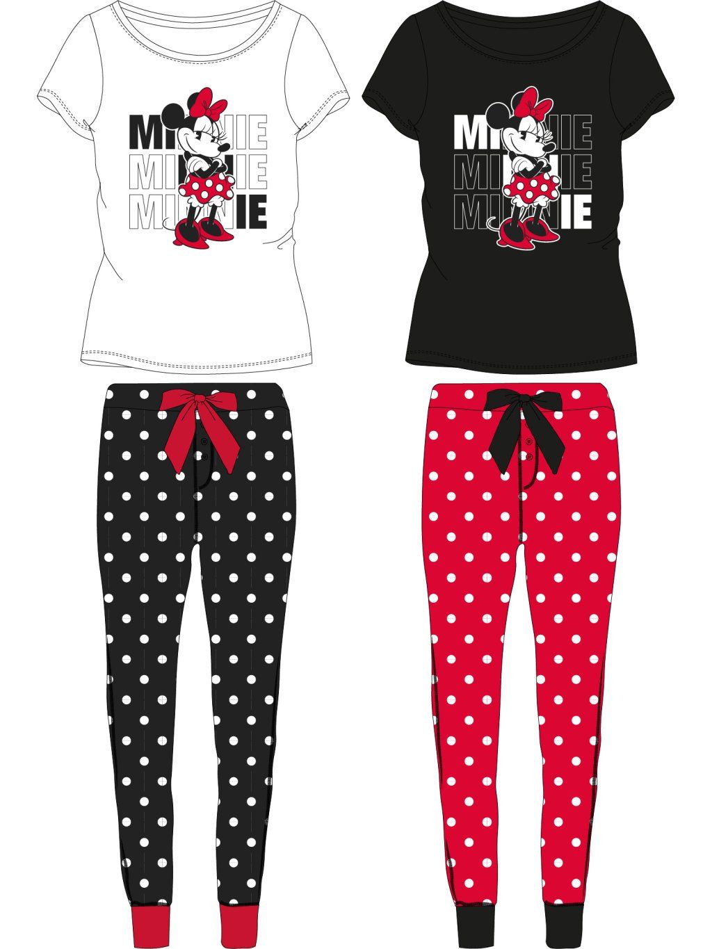 Damska piżama z krótkim rękawem i długimi spodniami, w pasie ściągana sznurkiem, plisy na końcach, motyw Myszki Minnie.
