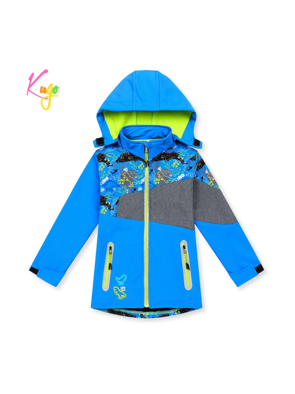 Chłopięca kurtka softshell na wiosnę, jesień ocieplona polarem, odpinany kaptur, dwie kieszenie zapinane na zamek, elementy odblaskowe