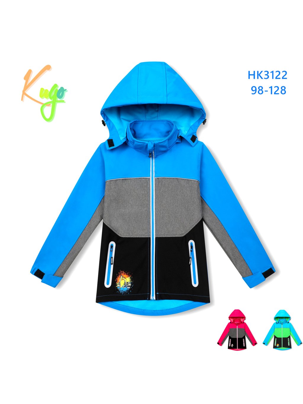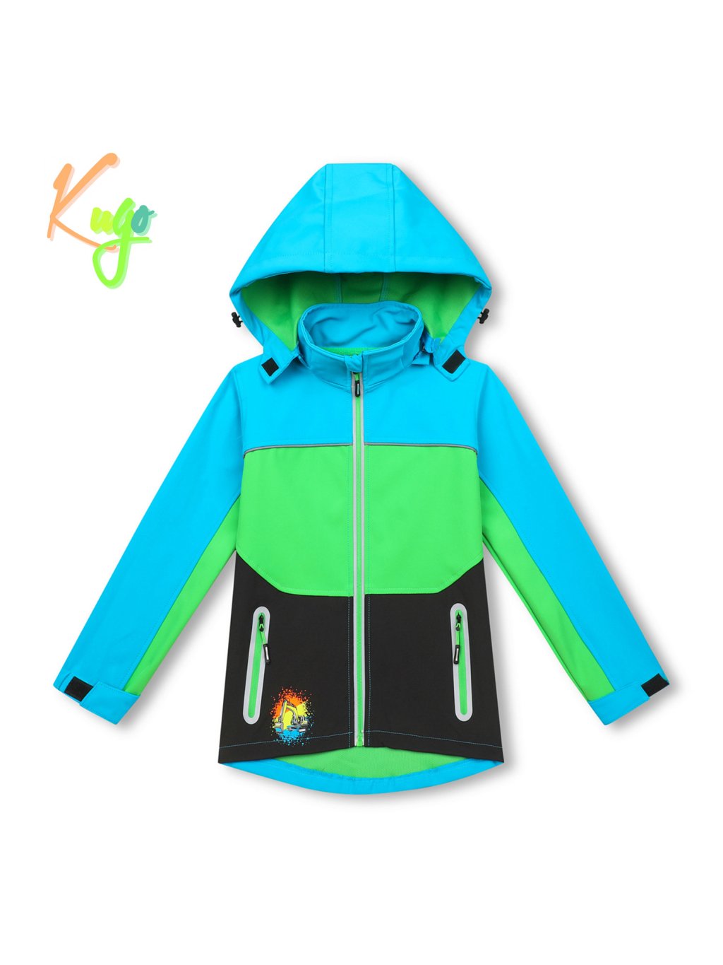 Kurtka softshell chłopięca na wiosnę, jesień, perforowana od wewnątrz, nie przemaka, nie przewiewa, dwie kieszenie zapinane na zamek, elementy sygnalizacyjne, kaptur odpinany - przy szyi można zapiąć oliwkę i rzep, rękawy można również zapiąć na rzep Na końcu rzep