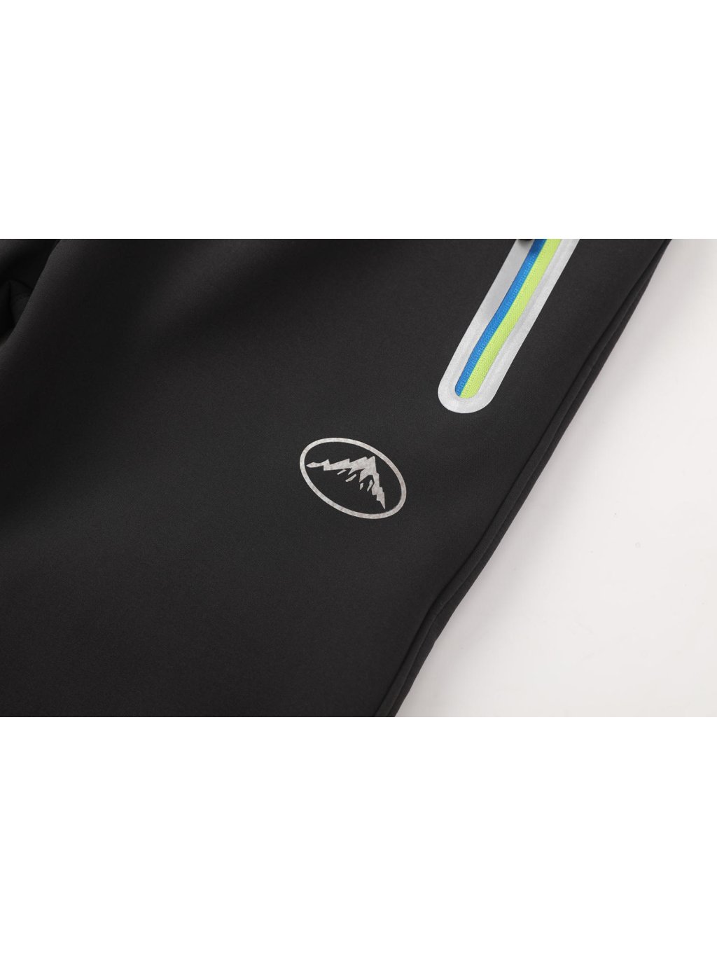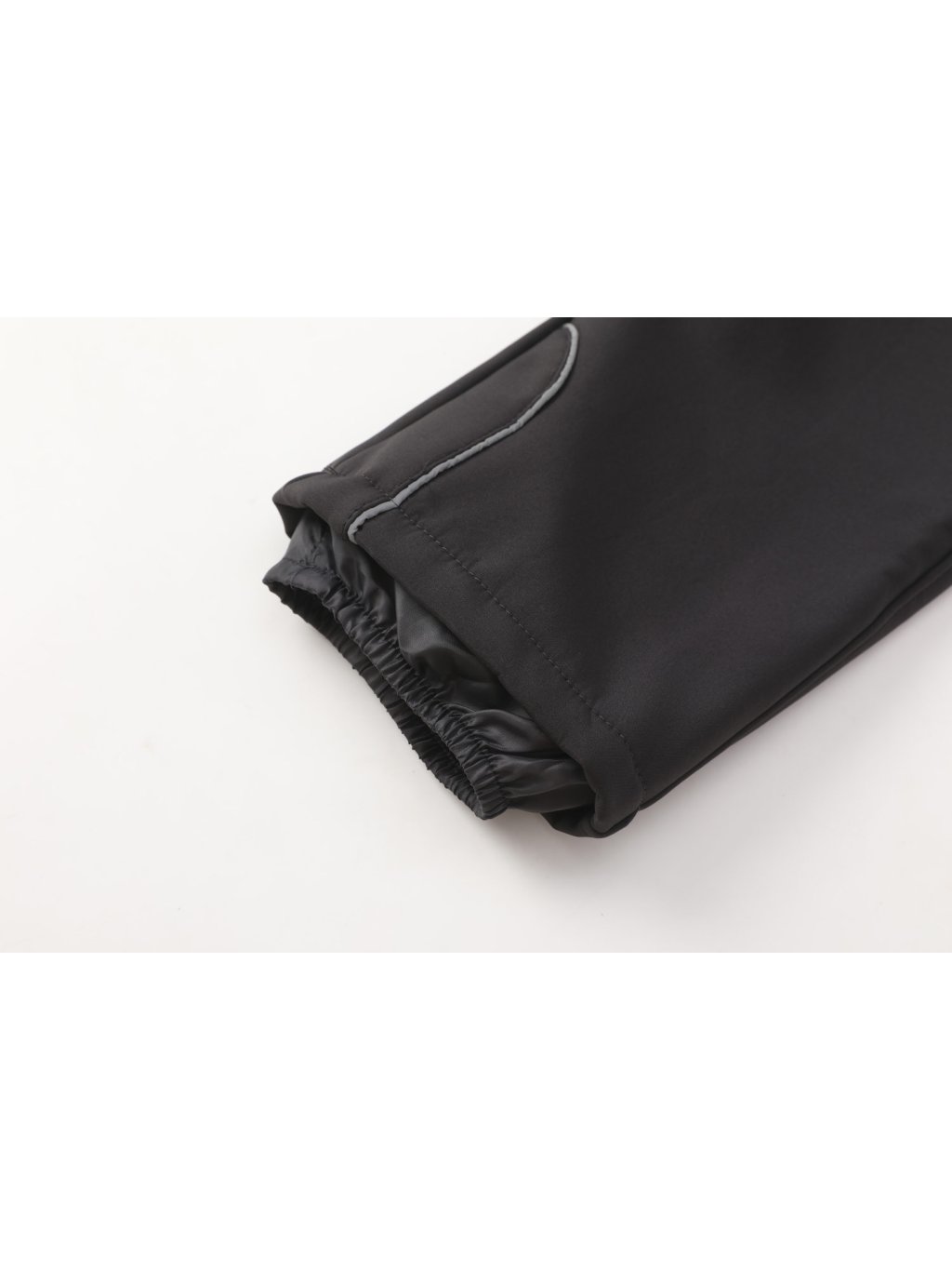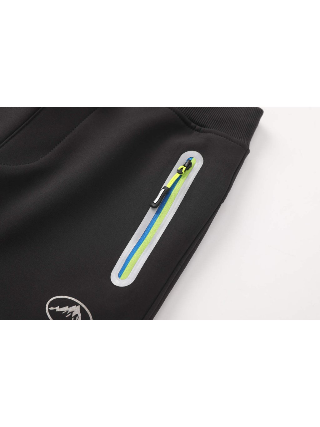 Chłopięce spodnie softshell ocieplane polarem, dwie kieszenie zapinane na zamek, elastyczny pas z gumką i oliwką do ściągania, wstawka w dolnej części nogawek, elementy odblaskowe.