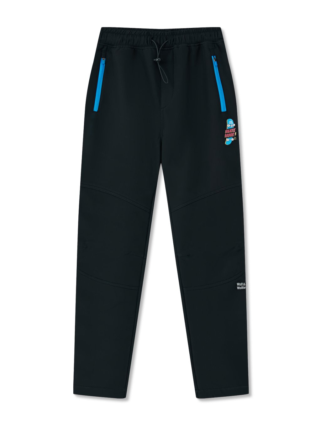 Spodnie typu softshell dla chłopców, ocieplane - Wolf & Wolfie B2596, czarne / turkusowe zamki