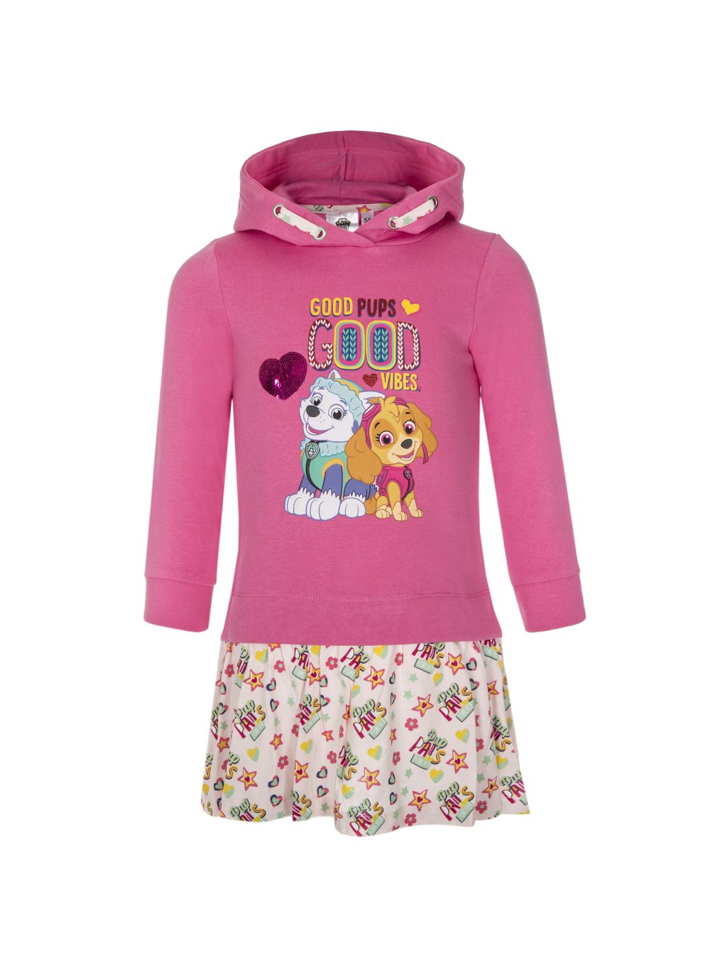 Dziewczęca sukienka dresowa z kapturem, Psi Patrol, dół bawełniany, w części bluzowej cekiny i brokat