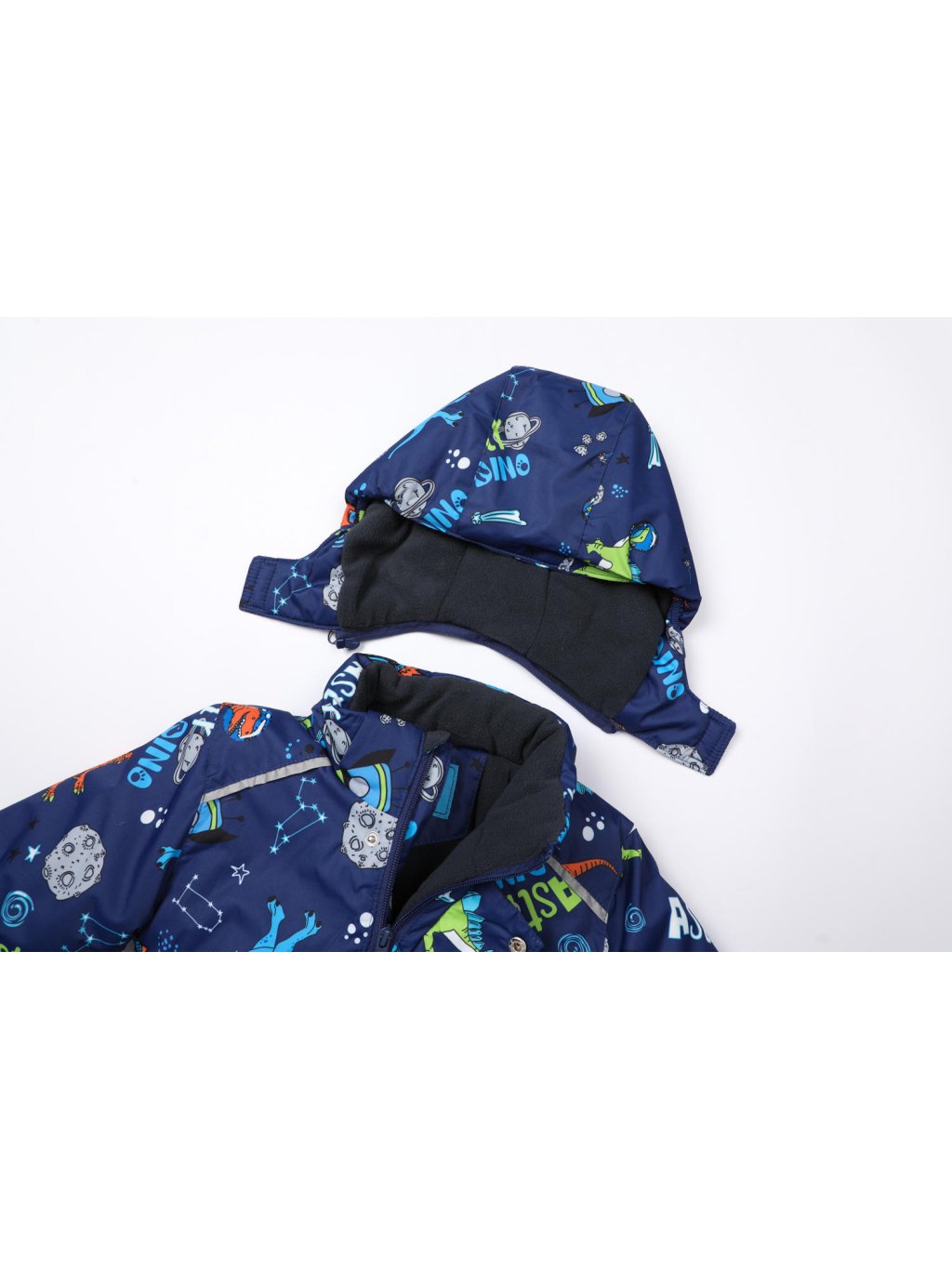 Zimowy kombinezon chłopięcy z odpinanym kapturem zapinanym na zamek. Zapinana na zamek błyskawiczny, na całej długości zamka dodatkowo zatrzaski umożliwiające zaczepienie. Mocny wodoodporny poliester, ocieplony polarem w górnej części, przesuwana podszewka nylonowa w części spodniowej i rękawach. Dwie kieszenie zapinane na zamek, elementy sygnalizacyjne, paski pod stopami.